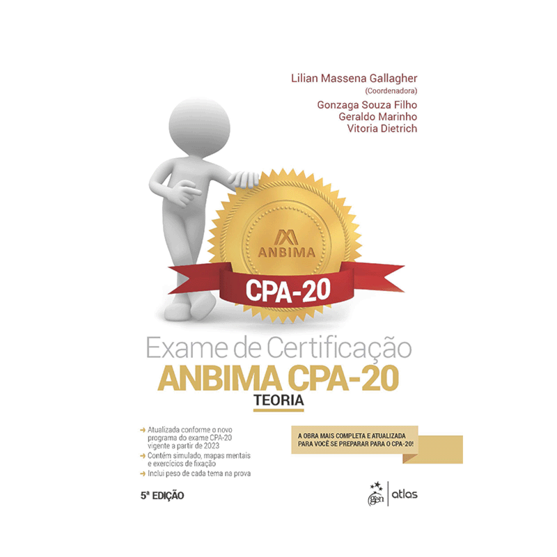 Leitura imprescindível para profissionais de varejo alta renda, private, corporate e investidores institucionais, Exame de Certificação ANBIMA CPA-20: Teoria chega à 5a edição totalmente revisto e renovado, de modo a abranger todo o conteúdo teórico incluído no exame da Associação Brasileira das Entidades dos Mercados Financeiro e de Capitais (ANBIMA), tanto para quem vai obter a certificação pela primeira vez quanto para quem necessita de atualização. Sob coordenação da professora Lilian Massena Gallagher, este livro foi didaticamente reestruturado por profissionais experientes do mercado financeiro e com expertise em cursos preparatórios para a certificação. Entre as novidades, inclui mapas mentais e novos exercícios ao final de cada capítulo para facilitar a aprendizagem. Para atender ao novo programa da prova, esta edição conta com: novo capítulo sobre conceitos de ASG; nova regulamentação de fundos de investimento; capítulos organizados conforme a relevância do tema da prova, com indicação de tempo a ser dedicado ao estudo e dicas extras; simulado desenvolvido para mensurar a fixação do conteúdo e a agilidade na solução das questões; QR Codes com legislação financeira atualizada.